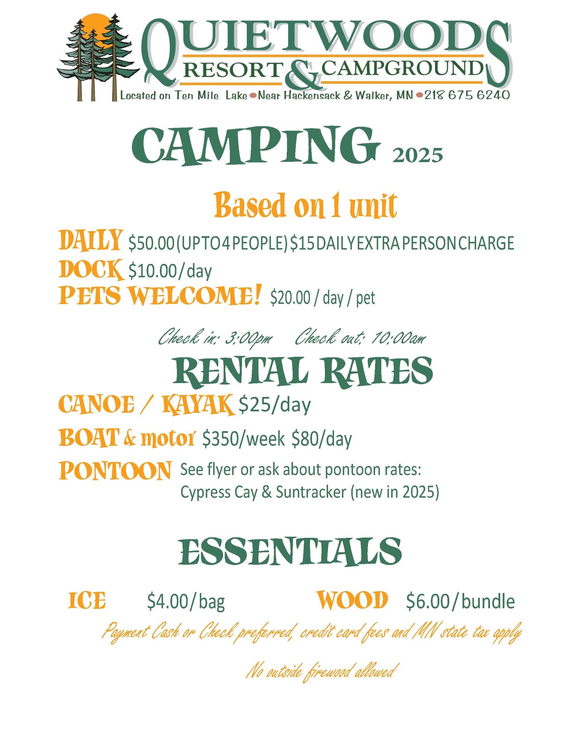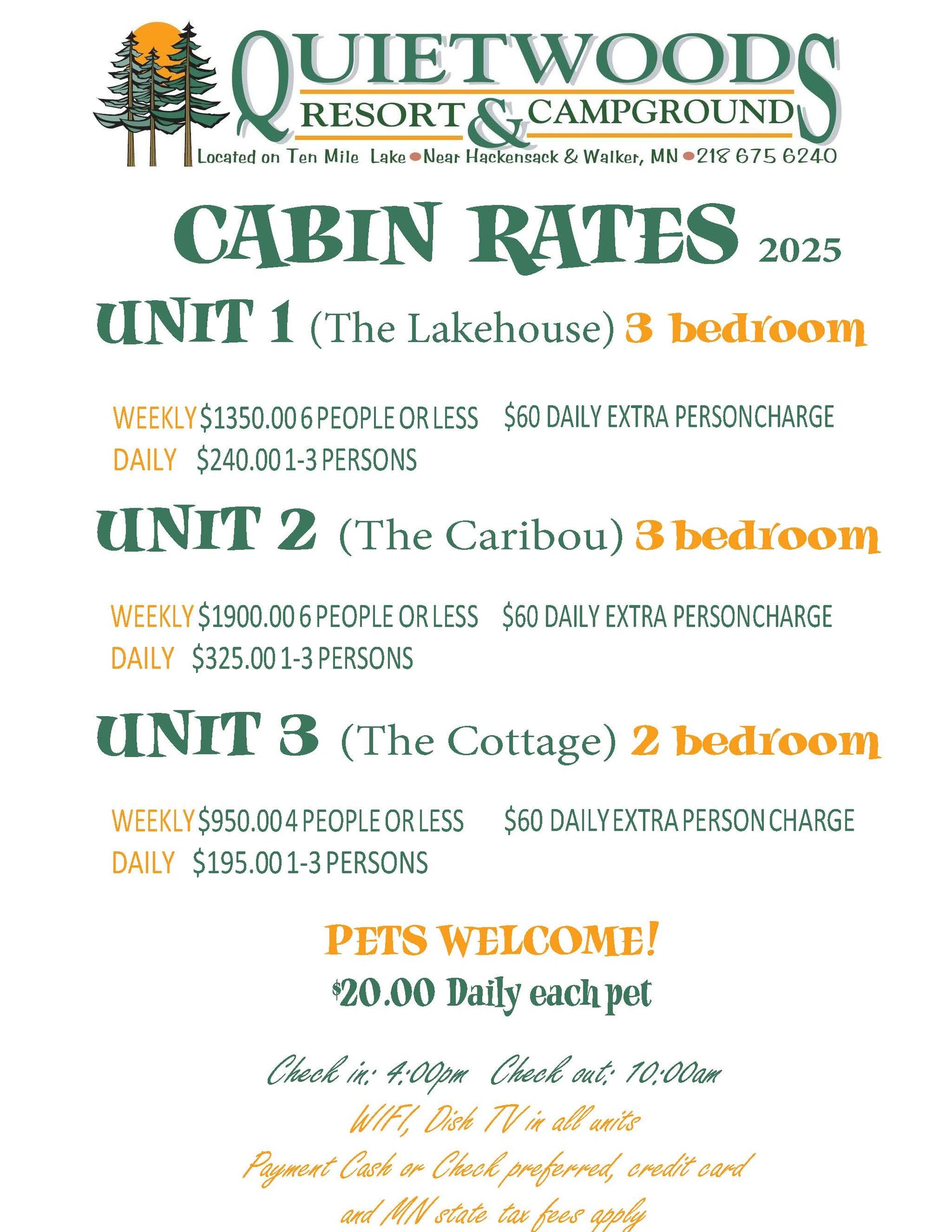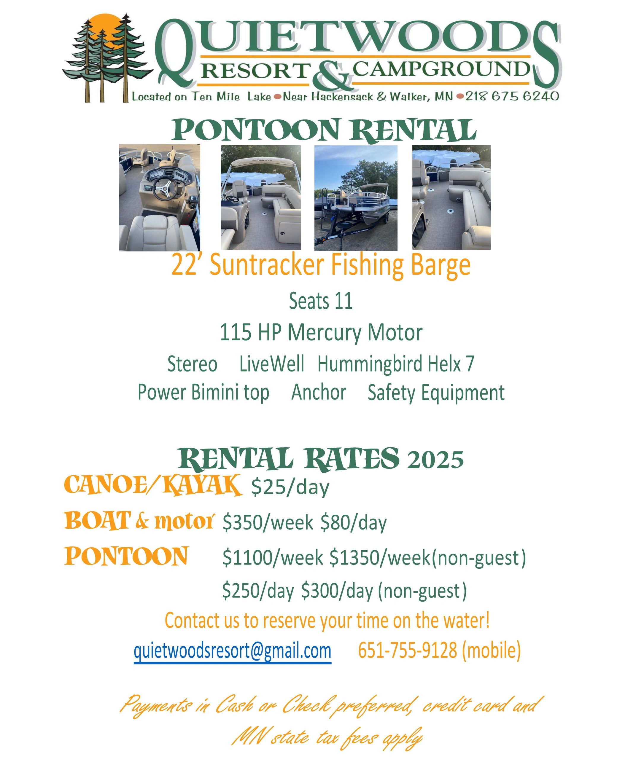 quietwoodsresort@gmail.com or 651-755-9128 ask for Jeff