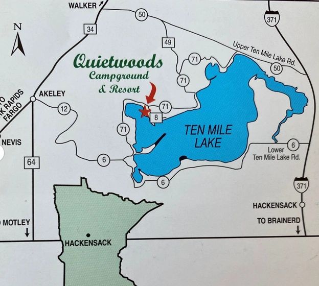 Quietwoods is located on the NW side of beautiful Ten Mile Lake. Travel approximately 1 1/2 miles north of Hackensack on 371. Turn left (west) on lower Ten Mile Lake Road (County 6) and follow this road for 7 miles. Turn right onto County 71 and travel 3.5 miles. Turn right on township Rd. 8 and follow this to our driveway.